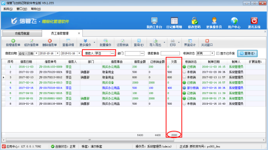 信管飛出納記賬軟件專業(yè)版包括員工借款管理功能,在員工借款管理中可以查看員工欠款信息,如下圖所示,以員工“李亞”為例,員工欠款是2000元。