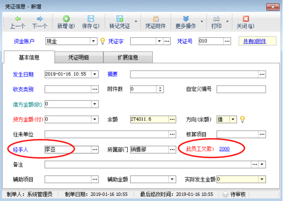 配置保存后,在功能導(dǎo)航窗點(diǎn)擊“出納管理”—》“現(xiàn)金日記賬”,新增憑證界面,選擇經(jīng)手人(員工)后,可以看到憑證信息界面顯示此經(jīng)手人(員工)的欠款信息,如下圖所示:
