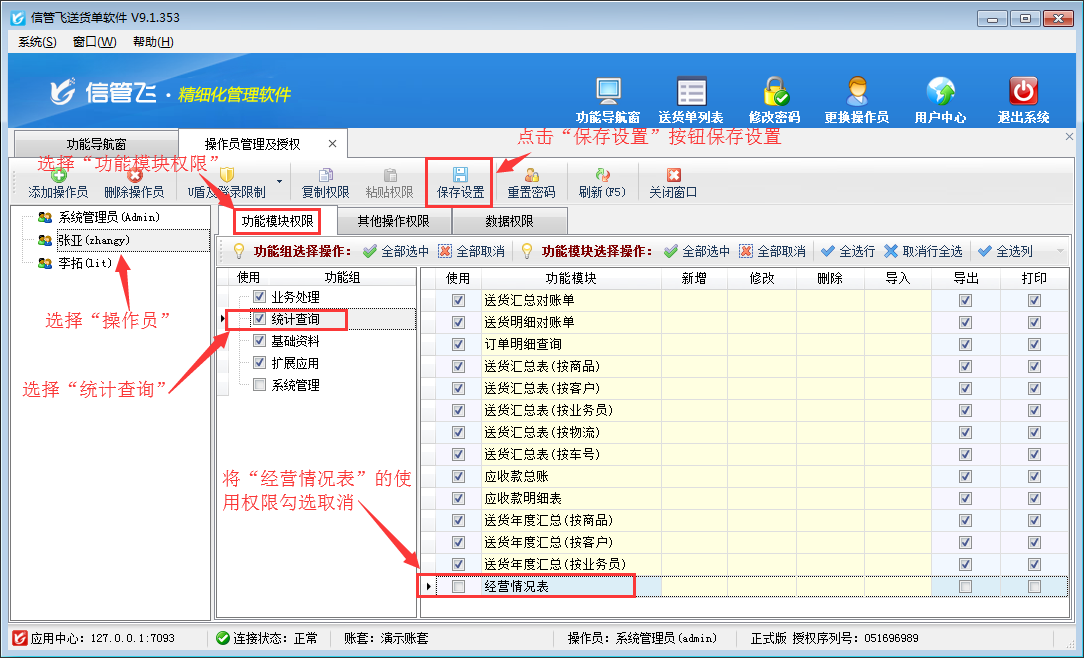 登錄軟件,在功能導(dǎo)航窗點(diǎn)擊“系統(tǒng)管理”—》“操作員及授權(quán)”,進(jìn)入“操作員管理及授權(quán)”界面,選擇操作員“張亞”,在其右側(cè)的功能模塊權(quán)限內(nèi)選擇“統(tǒng)計(jì)查詢”,將經(jīng)營情況表的“使用”權(quán)限勾選取消,然后保存設(shè)置,如下圖所示。