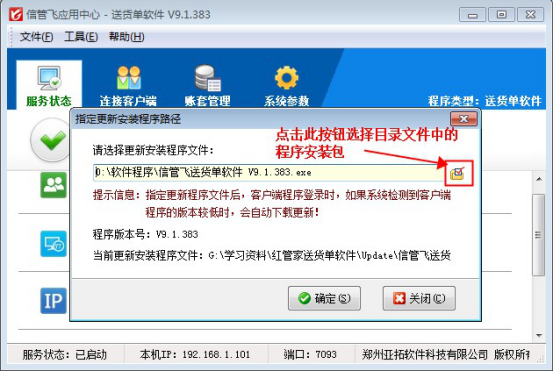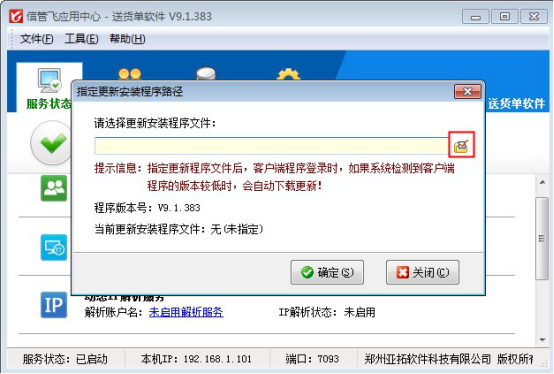信管飛送貨單軟件、信管飛RMS軟件、信管飛倉(cāng)庫(kù)管理軟件等都支持網(wǎng)絡(luò)版本(即可以多臺(tái)機(jī)器同時(shí)使用,數(shù)據(jù)共享,數(shù)據(jù)集中存儲(chǔ)在一臺(tái)機(jī)器上),軟件會(huì)不定期更新新版本,網(wǎng)絡(luò)版多臺(tái)電腦使用的時(shí)候,每次更新程序需要每臺(tái)電腦都下載最新版安裝程序進(jìn)行安裝,非常麻煩。軟件支持在主機(jī)電腦的應(yīng)用中心程序上指定更新安裝程序,便于客戶(hù)端登錄的時(shí)候如版本不一致會(huì)提示直接下載安裝程序。