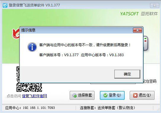 點(diǎn)擊“確定”指定更新程序后,點(diǎn)擊客戶(hù)端電腦登錄軟件,登錄時(shí)會(huì)提示“客戶(hù)端與應(yīng)用中心版本號(hào)不一致,請(qǐng)升級(jí)更新后再登錄”,我們點(diǎn)擊“確定”按鈕,如下圖所示: