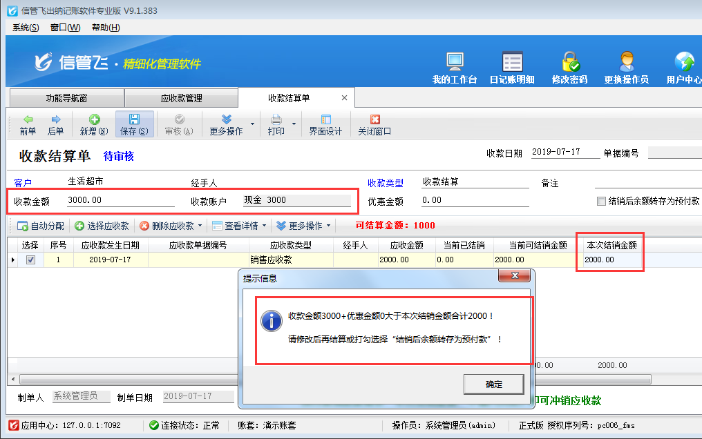 在應收款管理界面點擊“收款結算”按鈕可以打開收款結算單對應收款進行收款結算,單據主體“收款金額”錄入3000元,單據明細中“本次結銷金額”錄入2000元,保存收款結算單時系統提示“收款金額3000+優惠金額0大于本次結銷金額合計2000!........”無法保存成功!