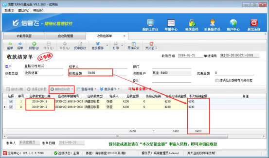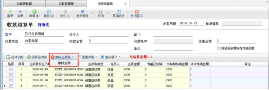 彈出“收款結算單”界面,默認是顯示所有的未結銷的應收款,如需要只結銷部分應收款(示例結銷2019-8-19的應收款),有以下兩種方法: