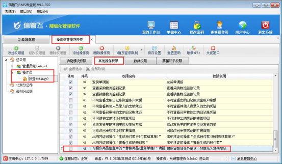 本文以“信管飛RMS專業版”為例,在功能導航窗點擊“系統管理”—》“操作員及授權”進入操作員授權及管理界面,選擇操作員組的操作員,如下圖1所示:選擇操作員“張亞”,在右側權限設置界面,選擇“其他操作權限”,把權限“可操作商品信息中的“替換商品(業務單據)”功能”取消勾選。然后保存配置。