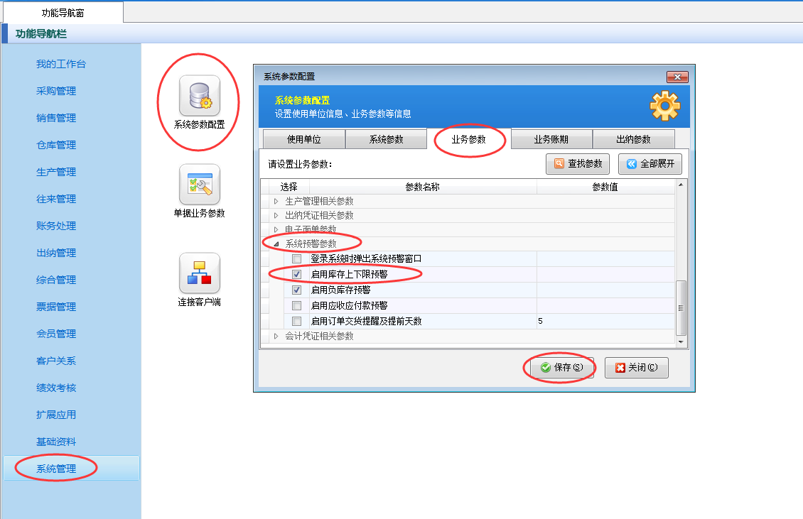 在功能導(dǎo)航窗點(diǎn)擊“系統(tǒng)管理”—》“系統(tǒng)參數(shù)設(shè)置”—》“業(yè)務(wù)參數(shù)”,即可進(jìn)入到“業(yè)務(wù)參數(shù)”配置界面,在系統(tǒng)預(yù)警參數(shù)內(nèi)將“啟用庫(kù)存上下限預(yù)警”參數(shù)啟用一下,設(shè)置完成后點(diǎn)擊“保存”按鈕保存配置,如下圖所示。
