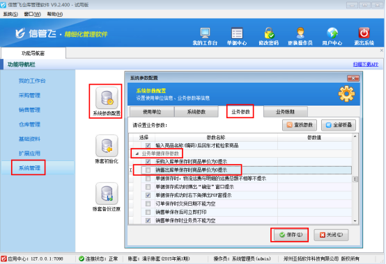 在功能導(dǎo)航窗點(diǎn)擊“系統(tǒng)管理”—》“系統(tǒng)參數(shù)配置”—》“業(yè)務(wù)參數(shù)”,即可進(jìn)入到“業(yè)務(wù)參數(shù)”配置界面,在業(yè)務(wù)單據(jù)保存參數(shù)內(nèi)找到“銷售出庫(kù)單保存時(shí)商品單價(jià)為0提示”參數(shù),把這個(gè)參數(shù)的勾選去掉,然后保存設(shè)置,如下圖2所示。
