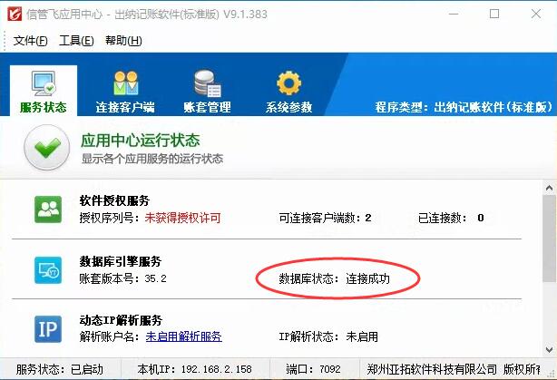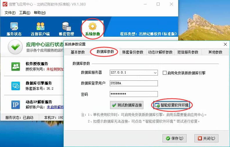 智能修復軟件環境完成后,請重啟應用中心程序,然后查看下數據庫連接狀態是否顯示為連接成功(如下圖所示),數據庫狀態為連接成功,則軟件即可正常登錄。