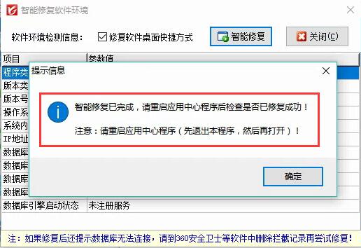 如智能修復軟件環境完成后,重啟應用中心程序數據庫狀態仍顯示為連接失敗,請聯系我們在線客服解決。