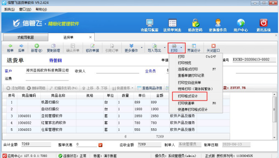 以信管飛送貨單軟件為例,示范下如何調(diào)整模板的頁邊距。功能導(dǎo)航窗選擇“業(yè)務(wù)處理”—》“新開送貨單”界面,開單保存后,在打印按鈕下選擇打印格式設(shè)計,可進(jìn)入打印格式設(shè)計界面,如下圖所示: