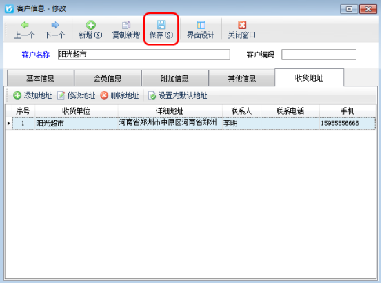 在功能導航窗點“基礎資料”—》“客戶信息”即可進入“客戶信息”界面,如圖1所示,點擊“修改”按鈕,打開客戶信息修改窗口,基本信息中的“詳細地址”就是開單默認地址,點擊“收貨地址”,可以維護其他的收貨地址信息。