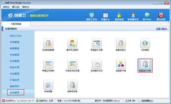 新增賬套登錄后,信管飛RMS軟件新增賬套是未啟用狀態(tài),先在“基礎(chǔ)資料”—“期初建賬”中啟用下賬套,啟用后在功能導(dǎo)航窗點(diǎn)擊“系統(tǒng)管理”—》“賬套備份還原”,進(jìn)入賬套備份還原界面。如下圖所示: