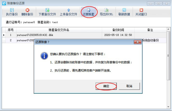 上傳完成后,點(diǎn)擊上傳的備份文件,點(diǎn)擊“還原賬套”,把本地?cái)?shù)據(jù)還原到云應(yīng)用中心上,還原后重新登錄就可以查看之前的數(shù)據(jù),如下圖所示: