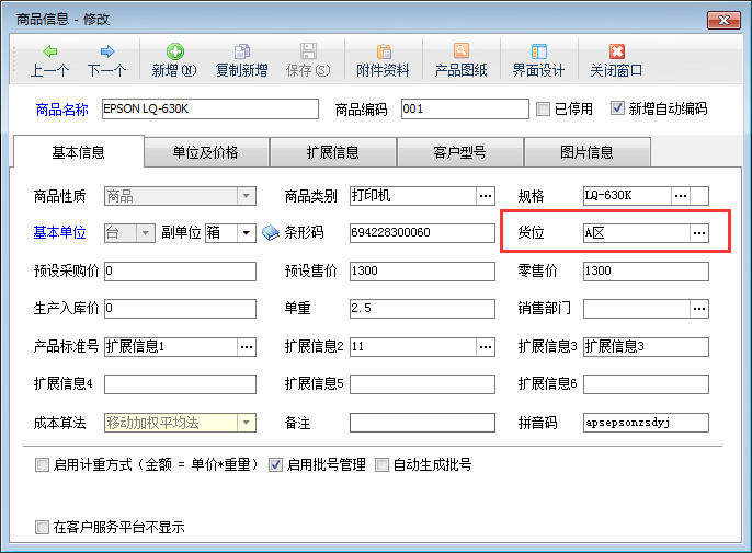 進銷存管理軟件在新增商品信息時支持設置每個商品的貨位信息,用于管理商品實際在倉庫中存儲的位置,如下圖所示。另外如果商品信息全部建立好之后,需要補錄入商品貨位,分別修改每個商品信息依次設置每個商品貨位會比較麻煩,本篇文章介紹下如何批量設置商品貨位?