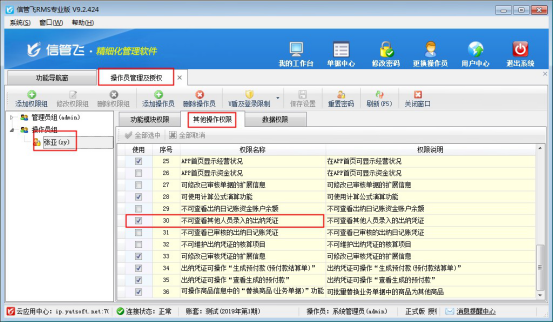 信管飛RMS標準版和專業版、信管飛出納記賬軟件都支持操作員不可查看其他人員憑證的權限,本文以“信管飛RMS專業版為例”示范下如何設置操作員不可查看其他人員錄入的憑證?