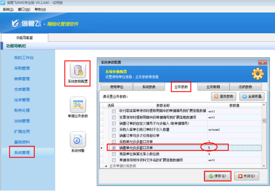 在功能導航窗點擊“系統(tǒng)管理”—》“系統(tǒng)參數(shù)配置”—》“業(yè)務參數(shù)”,即可進入到“業(yè)務參數(shù)”界面,在業(yè)務單據(jù)相關參數(shù)內(nèi),勾選“銷售單允許多窗口開單”參數(shù),參數(shù)值內(nèi)錄入需要銷售單的窗口數(shù),然后點擊“保存”按鈕保存配置,如下圖所示: