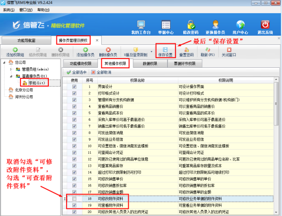 在功能導航窗點擊“系統(tǒng)管理”—》“操作員及授權(quán)”打開操作員管理及授權(quán)界面,選擇操作員“李拓”,在“其他操作權(quán)限”中,取消勾選“可修改附件資料”,勾選“可查看附件資料”,然后點擊“保存設(shè)置”按鈕保存權(quán)限設(shè)置,如下圖所示:
