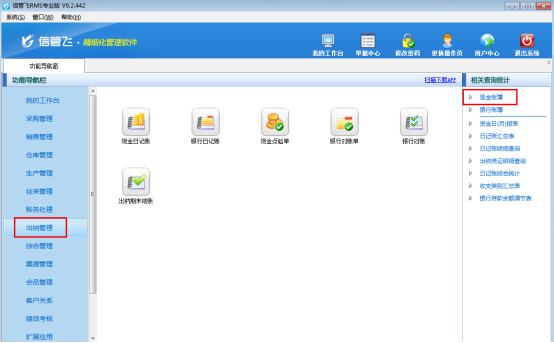 點擊功能導(dǎo)航窗中的“出納管理”,在界面右側(cè)“相關(guān)查詢統(tǒng)計”下點擊“現(xiàn)金賬簿”,如圖2所示。