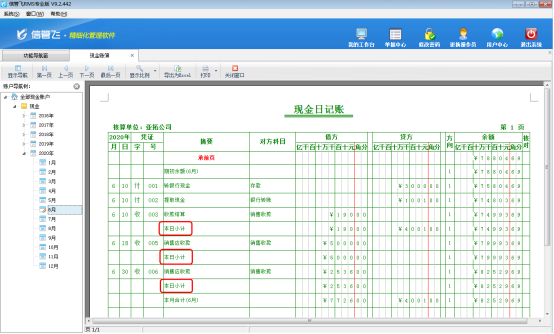 系統(tǒng)進入“現(xiàn)金賬簿”窗口,在窗口左側(cè)的導(dǎo)航樹中,所有現(xiàn)金帳戶可以按年按月顯示帳簿信息,我們點擊查看2020年6月的現(xiàn)金賬簿信息,如圖3所示,這是現(xiàn)金賬簿顯示本日小計的效果圖。