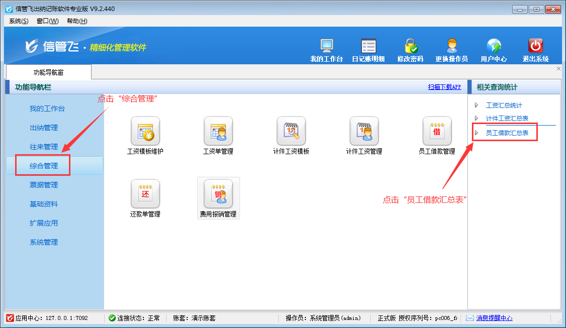 在功能導(dǎo)航窗點(diǎn)擊“綜合管理”—》“員工借款匯總表”即可進(jìn)入員工借款匯總表界面,如下圖所示。