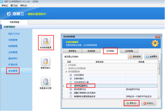 在功能導(dǎo)航窗中點(diǎn)擊“系統(tǒng)管理”—》“系統(tǒng)參數(shù)配置”,即可進(jìn)入“系統(tǒng)參數(shù)設(shè)置”界面,點(diǎn)擊“業(yè)務(wù)參數(shù)”,如圖1所示,在庫存管理參數(shù)內(nèi)找到“啟用商品副單位”參數(shù),勾選這個(gè)參數(shù),然后保存。