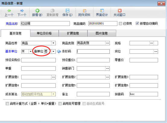啟用商品副單位后,在商品信息中可以維護(hù)副單位。在功能導(dǎo)航窗點(diǎn)擊“基礎(chǔ)資料”—》“商品信息”,新增商品窗口選擇商品副單位,如圖2所示。