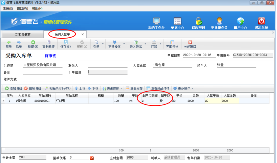 商品保存后,在功能導(dǎo)航窗點(diǎn)擊“采購管理”—》“采購入庫單”,新增采購入庫單,在業(yè)務(wù)單據(jù)明細(xì)中可以輸入副單位的數(shù)量,如圖3所示。