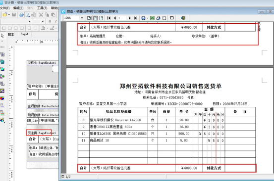 以“信管飛送貨單軟件”為例,打開一個已開送貨單,點擊打印按鈕下的打印格式設計進入打印格式設計界面,選擇默認模板銷售出庫單打印模板(三聯單3)后打開設計格式界面,點擊打印預覽界面可以看到模板的合計都是每頁都顯示的,如下圖所示: