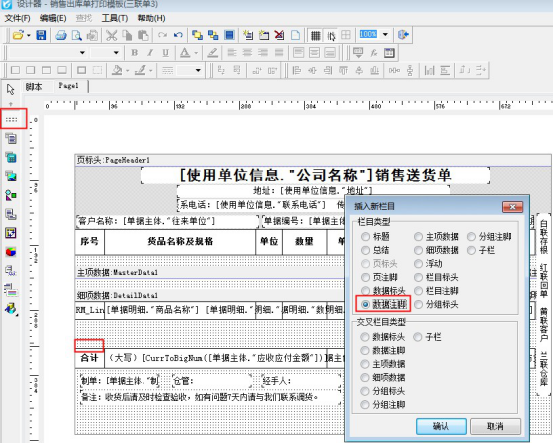 需要合計在最后一頁顯示,需要把“頁注腳”換為“數據注腳”,在模板設計器界面,點擊“頁注腳”進行刪除,然后點擊左側工具欄的第一項,選擇“數據注腳”,添加到合計的位置處,如下圖所示: