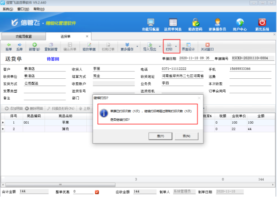 設置報表打印超過打印次數提示后,在業務單據打印時(基礎資料、統計查詢功能中沒有限制)如果單據打印的次數超過限制數量,系統會提示“單據已打印次數(1次),繼續打印將超過限制打印次數(1次),是否繼續打印?”,如下圖所示: