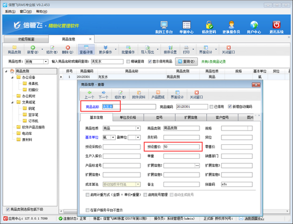 信管飛RMS、信管飛送貨單軟件等都支持開單前錄入好商品的預(yù)設(shè)價(jià)格,如預(yù)設(shè)采購價(jià)、預(yù)設(shè)售價(jià)等,方便開單選擇商品時(shí)自動(dòng)獲取價(jià)格信息。如下圖所示,設(shè)置商品“洗發(fā)水”預(yù)設(shè)售價(jià)50元/瓶,以信管飛RMS(進(jìn)銷存管理軟件)為例示范一下如何設(shè)置銷售開單時(shí)自動(dòng)取商品預(yù)設(shè)售價(jià)?
