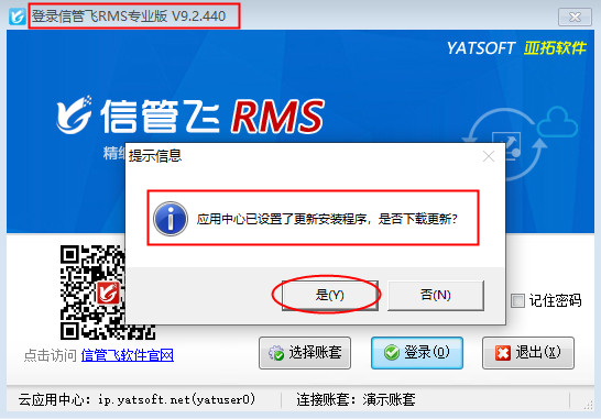 有些用戶登錄云賬套時,系統提示“客戶端與云應用中心要求的版本號不一致,請升級更新后再登錄!”如下圖1所示,登錄時之所以會提示升級版本,是因為亞拓軟件自主研發的軟件是不斷升級優化的,發布新版本后,云賬套模式的客戶端需要和云應用中心的版本一致才可以登錄,下面我們以信管飛RMS專業版為例,介紹下如何升級到最新版本軟件?