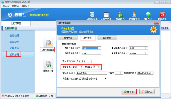 在功能導(dǎo)航窗點擊“系統(tǒng)管理”—》“系統(tǒng)參數(shù)配置”—》“系統(tǒng)參數(shù)”,在“系統(tǒng)參數(shù)”界面可以設(shè)置“普通發(fā)票稅率”及“增值稅發(fā)票稅率”(這里分別設(shè)置為3%及13%),設(shè)置完之后點擊“保存”按鈕保存配置,如下圖所示:
