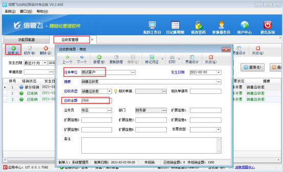 示范下銷項(xiàng)發(fā)票如何關(guān)聯(lián)應(yīng)收款記錄。首先先登記一筆應(yīng)收款,在功能導(dǎo)航窗點(diǎn)擊“往來管理”—》“應(yīng)收款管理”,點(diǎn)擊工具欄“新增”按鈕新增一筆應(yīng)收款記錄如下圖所示: