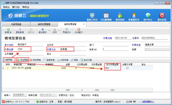 默認(rèn)新增的記錄是未開票狀態(tài),返回功能導(dǎo)航窗,點(diǎn)擊“票據(jù)管理”—》“銷項(xiàng)發(fā)票管理”界面上點(diǎn)擊“新增發(fā)票”,在新增界面選擇客戶“測(cè)試客戶”,開票方式選擇“按單據(jù)”,點(diǎn)擊“添加明細(xì)”按鈕,選擇界面發(fā)票類型選擇“全部”,勾選應(yīng)收款明細(xì)記錄。輸入開票金額后點(diǎn)擊分配明細(xì),把開票金額分配至“本次開票金額”中,然后輸入發(fā)票號(hào)保存單據(jù),如下圖所示: