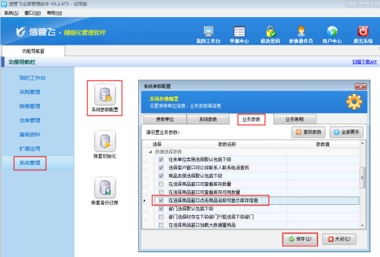 在功能導航窗,點擊“系統管理”—》“系統參數配置”—》“業務參數”,即可進入到“業務參數”配置界面,在“數據選擇參數”內打鉤啟用“在選擇商品窗口點擊商品名稱可顯示庫存信息”參數,然后點擊“保存”按鈕保存設置,如下圖1所示: