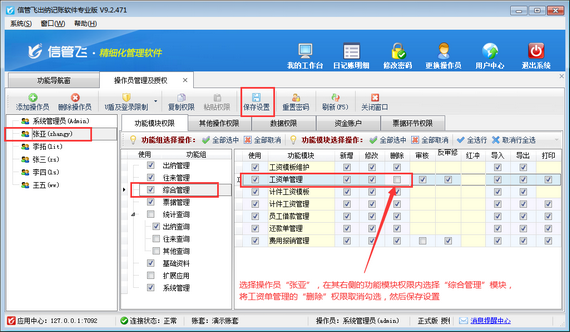 登錄軟件,在功能導航窗點擊“系統管理”—》“操作員及授權”,進入“操作員管理及授權”界面,選擇操作員“張亞”,在其右側的功能模塊權限內選擇“綜合管理”模塊,將工資單管理的“刪除”權限取消勾選,然后保存設置,如下圖所示。