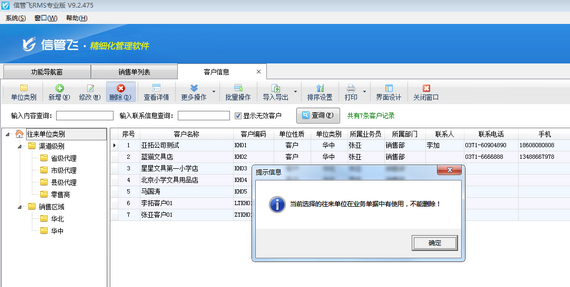 信管飛RMS是集采購管理、銷售管理、庫存管理、往來賬管理等為一體的進銷存管理軟件。經常會有用戶問到刪除客戶資料時會彈出提示信息:“當前選擇的往來單位在單據中有使用,不能刪除”(如下圖所示),刪除不了,為什么?