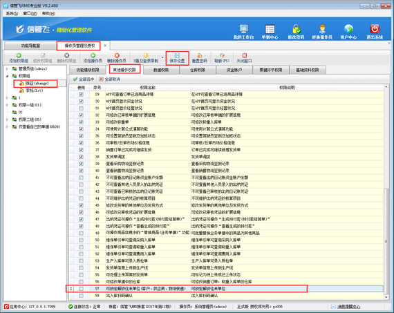 在功能導航窗點“系統管理”—》“操作員及授權”即可進入“操作員管理及授權”界面,選中操作員賬號,在“其他操作權限”界面將“可鎖定解鎖往來單位(客戶、供應商、物流快遞)”權限打鉤取消,然后保存權限設置,如下圖所示,設置操作員張亞沒有“可鎖定解鎖往來單位”權限。