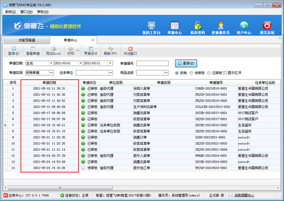 信管飛RMS是集采購管理、銷售管理、庫存管理、往來應收應付款等一體化的進銷存管理軟件,軟件支持單據中心功能,在單據中心內可以查詢到軟件內所填開的所有業務單據,可以根據單據日期、單據編號、單據類別、往來單位、商品名稱、審核狀態等信息查詢所需單據,查詢結果默認是根據單據日期正序顯示,如下圖所示。