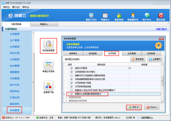 如需設置單據中心按單據日期倒敘顯示,優先顯示最新日期的單據,也可以在系統參數配置中啟用參數“單據中心按單據日期倒敘顯示”,如下圖所示,在功能導航窗點擊“系統管理”—》“系統參數配置”—》“業務參數”打開業務參數配置界面,將查詢統計參數中“單據中心按單據日期倒敘顯示”參數啟用一下,然后保存配置。