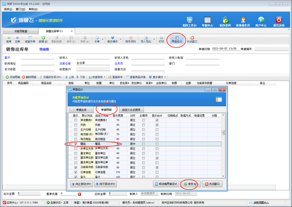 首先打開銷售出庫單開單界面,如下圖所示,軟件默認(rèn)不顯示“贈(zèng)品”項(xiàng),需要先通過界面設(shè)計(jì)配置將“贈(zèng)品”項(xiàng)勾選顯示出來。在工具欄點(diǎn)擊“界面設(shè)計(jì)”—》“單據(jù)明細(xì)”,找到“贈(zèng)品”項(xiàng),將其勾選顯示出來,然后點(diǎn)擊“保存”按鈕保存設(shè)置。