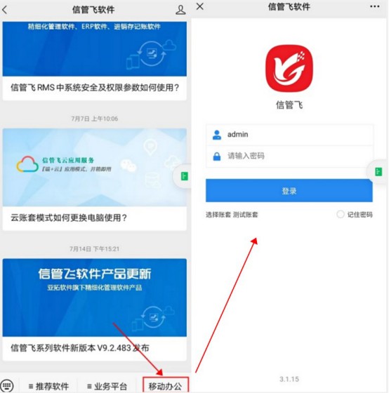 關注公眾號后,在微信界面可找到“信管飛軟件”,建議置頂(聊天窗口長按此項后點擊置頂公眾號)或者設置浮窗(登錄界面右上角點擊“...”,彈出界面點擊浮窗),方便后期直接打開,打開公眾號界面,點擊右下角“移動辦公”可彈出軟件登錄界面。如下圖所示: