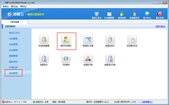 操作員權(quán)限設(shè)置完成后,使用操作員“張亞”登錄軟件,打開系統(tǒng)管理模塊,可以看到已無(wú)法查看到“系統(tǒng)參數(shù)配置”功能。
