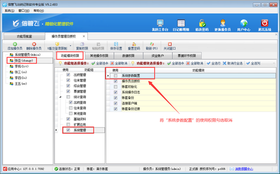 登錄軟件,在功能導(dǎo)航窗點(diǎn)擊“系統(tǒng)管理”—》“操作員及授權(quán)”,進(jìn)入“操作員管理及授權(quán)”界面,選擇操作員“張亞”,在其右側(cè)的功能模塊權(quán)限內(nèi)選擇“系統(tǒng)管理”模塊,將系統(tǒng)參數(shù)配置的“使用”權(quán)限勾選取消,然后保存設(shè)置,如下圖所示。