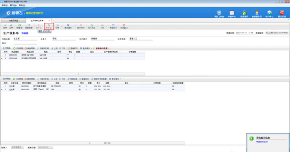 開生產(chǎn)領(lǐng)料出庫單,錄入單據(jù)主體、生產(chǎn)明細(xì)和領(lǐng)料明細(xì)信息,保存單據(jù)后可以看到生產(chǎn)領(lǐng)料單界面工具欄審核按鈕是灰色,操作員將無法再審核生產(chǎn)領(lǐng)料單單據(jù)。如下圖所示: