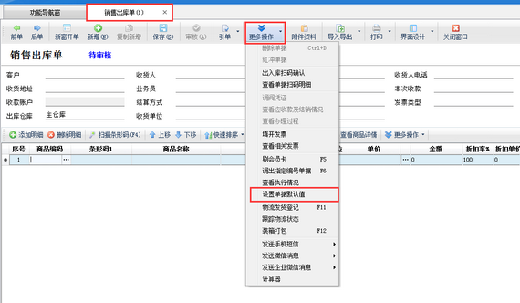在功能導(dǎo)航窗點“銷售管理”—》“銷售出庫單”,進入銷售出庫單界面,點擊“更多操作”按鈕,找到“設(shè)置單據(jù)默認值”,如下圖所示: