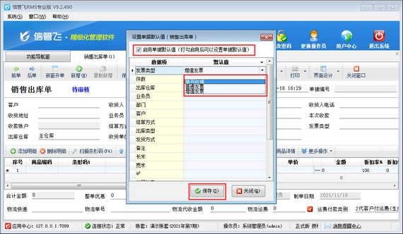 信管飛RMS軟件支持開銷售單選擇發(fā)票類型,可以根據(jù)實際需要選擇不同的開發(fā)票方式。在企業(yè)的經(jīng)營管理過程中,為了快速開單,提高效率,有時需要對單據(jù)設(shè)置默認值。本篇文章中以信管飛RMS軟件專業(yè)版為例詳細介紹下如何設(shè)置單據(jù)默認發(fā)票類型。
