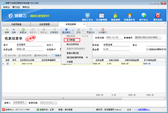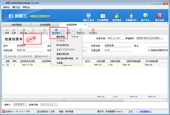 然后在收款結(jié)算單界面點擊“更多操作”—》“紅沖單據(jù)”,如下圖所示,單據(jù)紅沖后,點擊“更多操作”—》“刪除按鈕”,即可刪除收款結(jié)算單。