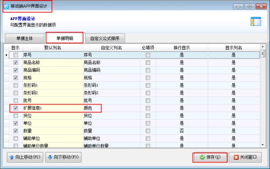 微信端界面設計需要在電腦端的開單界面界面設計中“移動端界面設計”中配置。打開電腦端軟件界面設計,選擇移動端界面設計,進入APP設計界面,勾選單據明細“擴展信息1”可向上移動到規格數據項后邊,然后保存配置,如下圖所示: