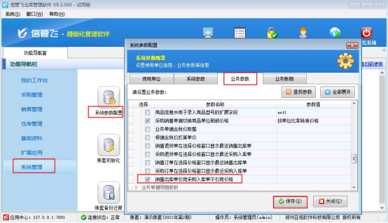 在功能導(dǎo)航窗點(diǎn)擊“系統(tǒng)管理”—》“系統(tǒng)參數(shù)配置”,“業(yè)務(wù)參數(shù)”中勾選啟用參數(shù)“業(yè)務(wù)單據(jù)價(jià)格參數(shù)”中的“銷售出庫(kù)單引用采購(gòu)入庫(kù)單不引用價(jià)格”,保存參數(shù)設(shè)置。如下圖所示: